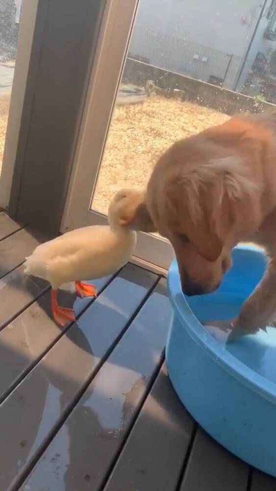 犬にプールを取られたアヒルが激おこ 片思いの相手からの攻撃にじっと耐えるワンちゃんがいじらしい 年9月19日 エキサイトニュース